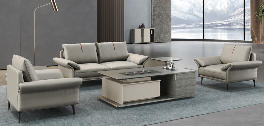 1、面料:选用头层黄牛皮,经液态浸色及防潮、防污等工艺处理、皮面更加柔软舒适、光泽持久性好,纹理细腻,富有弹性。 2、实木板框架:优质进口含水率低9%以下的硬木木方及5mm的多层夹板,经防虫、防腐等化学处理;3、海绵:采用杜邦公司的PU成型发泡高密度海绵高回弹海绵,表面有一层保护面,可防氧化,防碎,经过HD测试永不变形,靠背密度≧27kg/m3,座垫密度≧36kg/m3,回弹性≧35%,拉伸强度95kpa,撕裂强度达3.3N/cm,断裂伸长率达185%,压陷硬度190N。 4、工艺:采用人体工学设计,坐感舒适!
