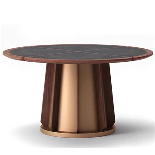 餐厅家具厂家为您展示现代中式餐厅包房钛金不锈钢岩板圆桌图片展示\价格说明\定做服务。